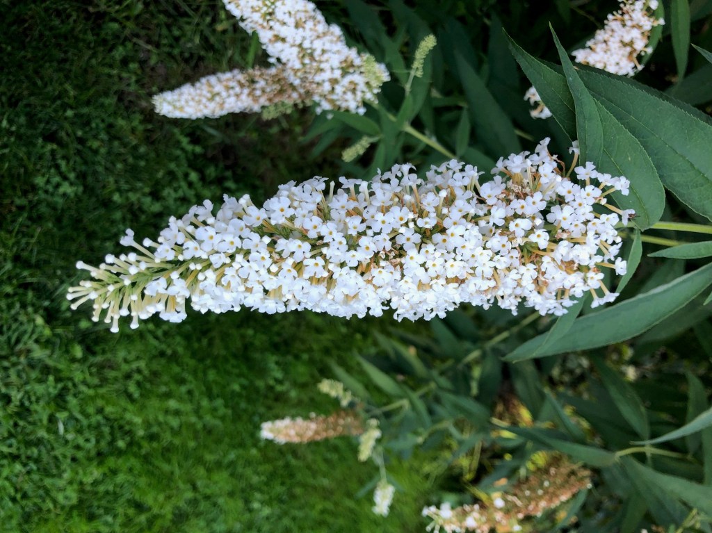 White Profusion is the largest by far. It’s just outside the catio, and is taller than the fence, which is something like seven-and-a-half feet tall. It’s probably five-six feet wide, though I’ve never actually measured it. And boy does it bring in the butterflies.