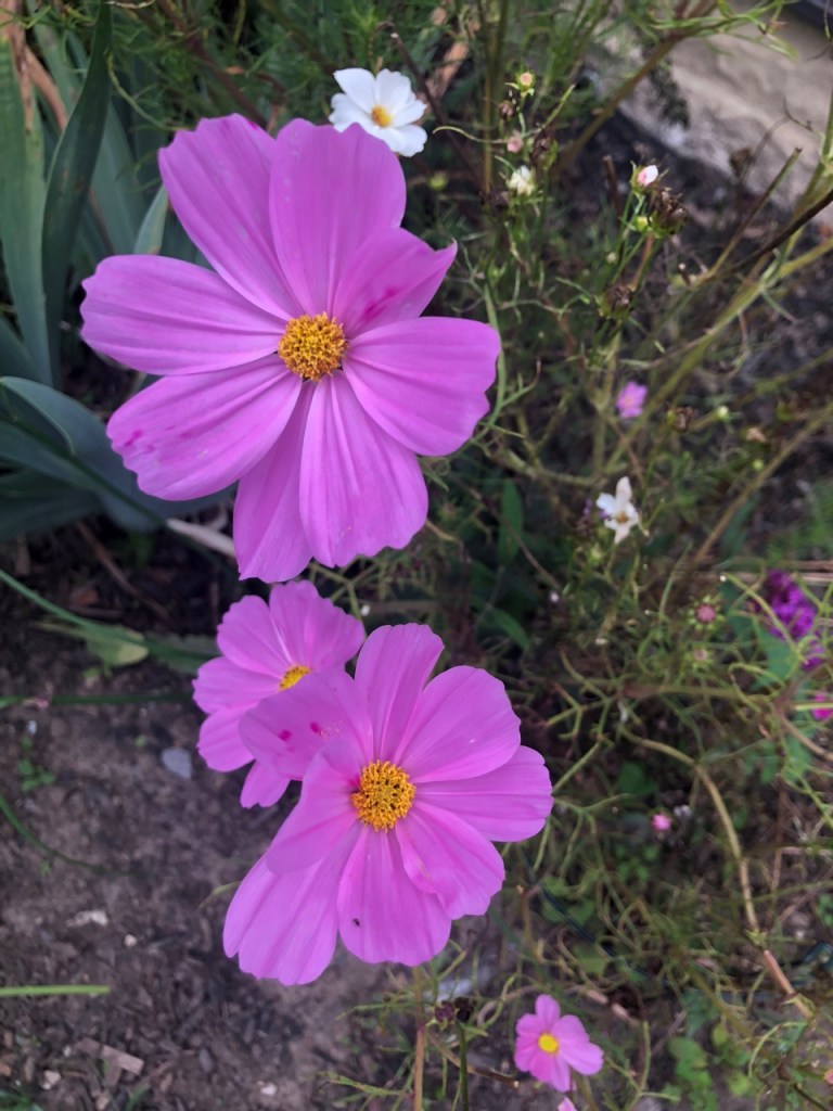Cosmos are a wonderful example. Lop the seedheads off often, and these guys will keep going until the frost takes them down.