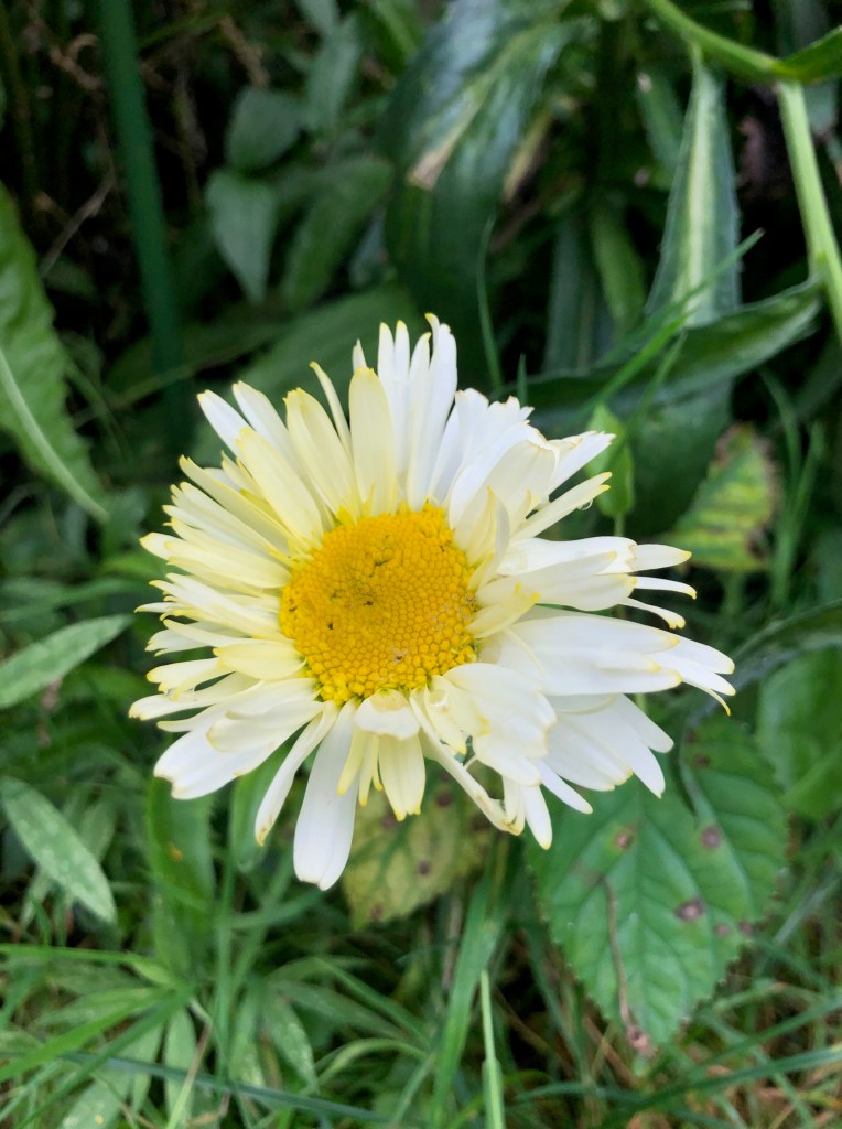 Like daisies that decided to rebloom. I can tell you this is the first year I’ve ever had that happen. They are normally an early summer bloomer and then that’s it! I did give them a big chop mid-summer to tidy them up. I do that with the Delphiniums, and that makes them rebloom – so maybe it’s the same for the daisies?