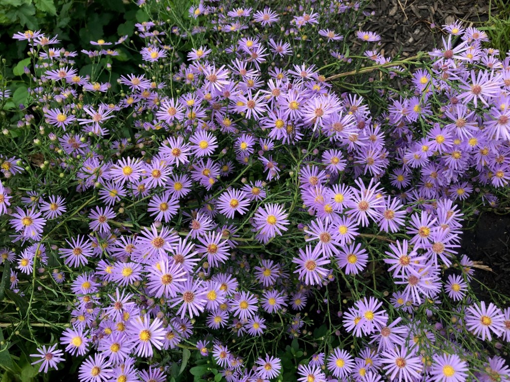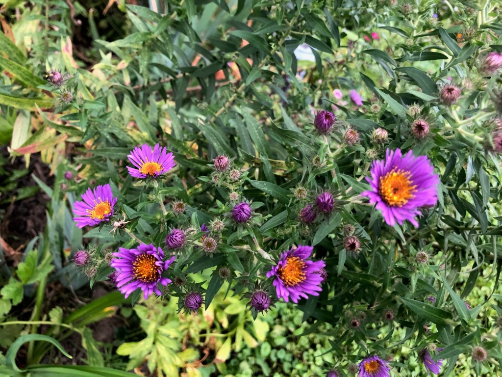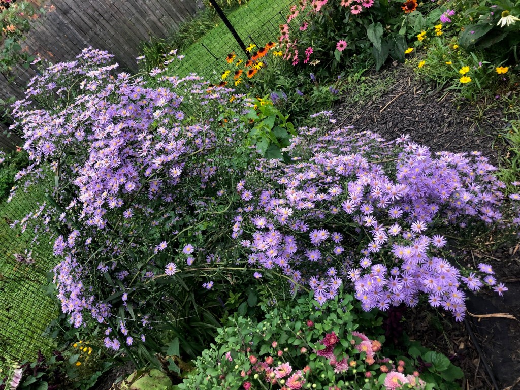 Out front is the New England Aster. It’s almost as tall, and the flowers are a little darker shade. I’m not sure if it will be quite as impressive with as many blooms, but it’s pretty none-the-less.