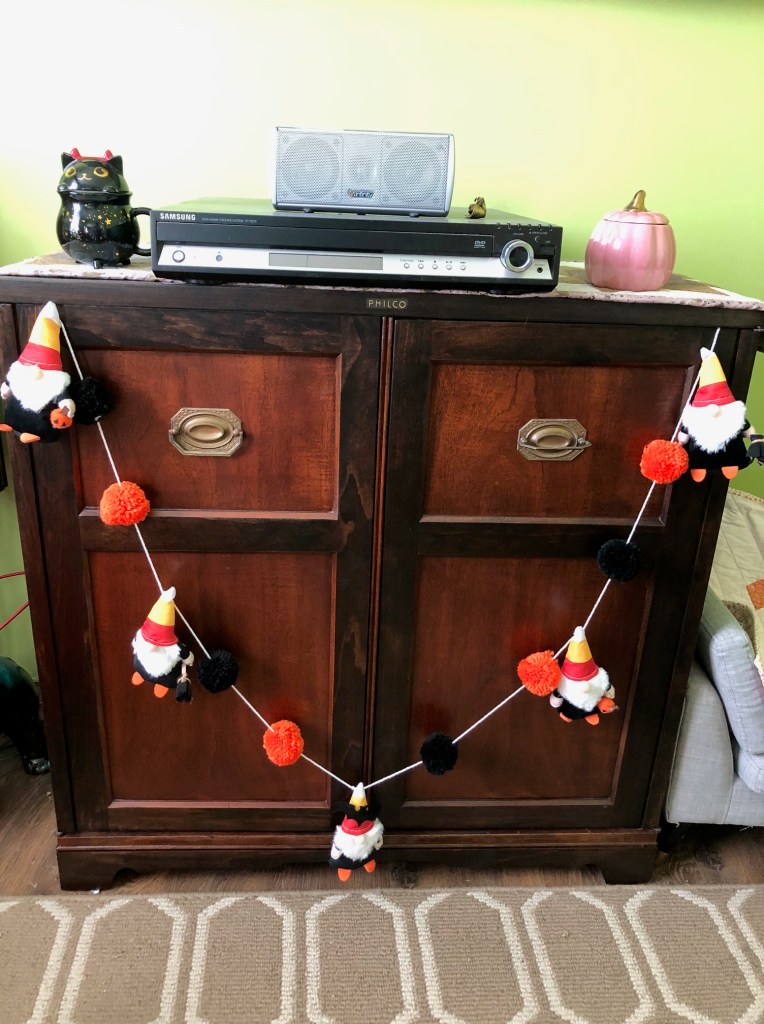 Several of you have seasonal buntings you put out… and I absolutely love the idea. I’ve been planning to make some, but then I found this one at Michaels and just had to get it and put in on the antique radio cabinet we have under the TV!