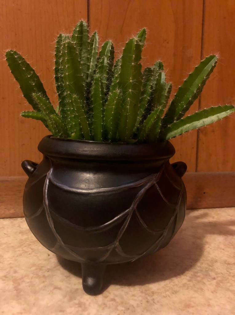 I also got this little cauldron planter to paint up. My original plan was to put my string of pearls plant in it, look it looked like little bubbles… but then I remembered I had this dragon fruit that was in need of planter… so in it went.