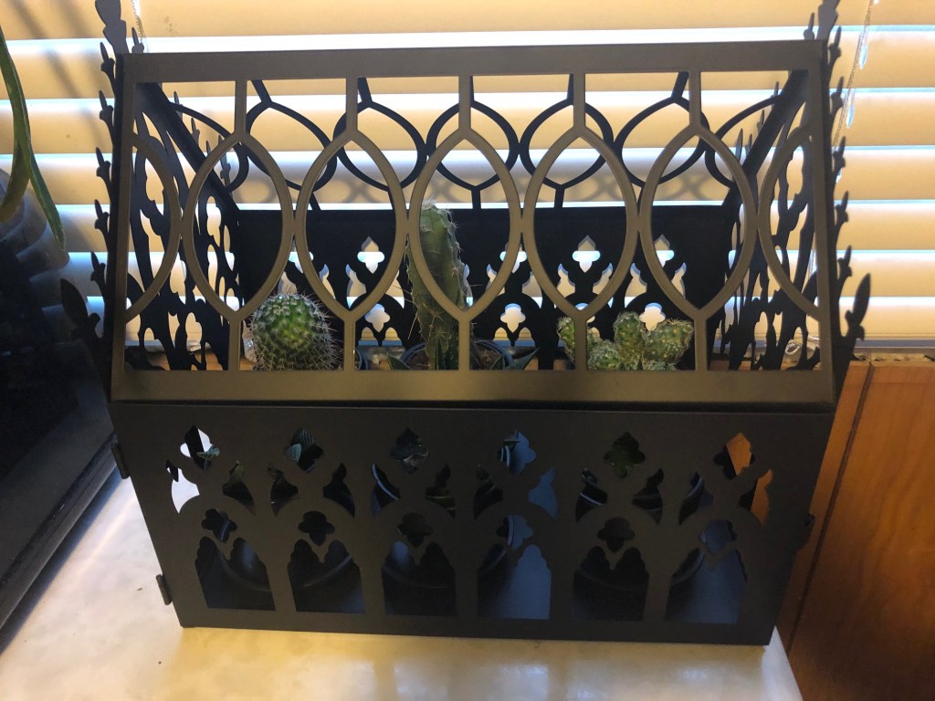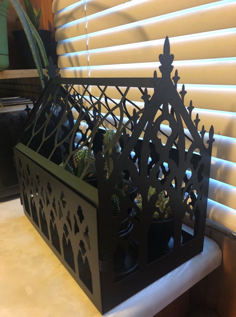It’s a candle holder I found at Michaels, but of course, I thought – I can put plants in that! So I got six little terracotta pots, painted them black and planted them up with some cacti and succulents.