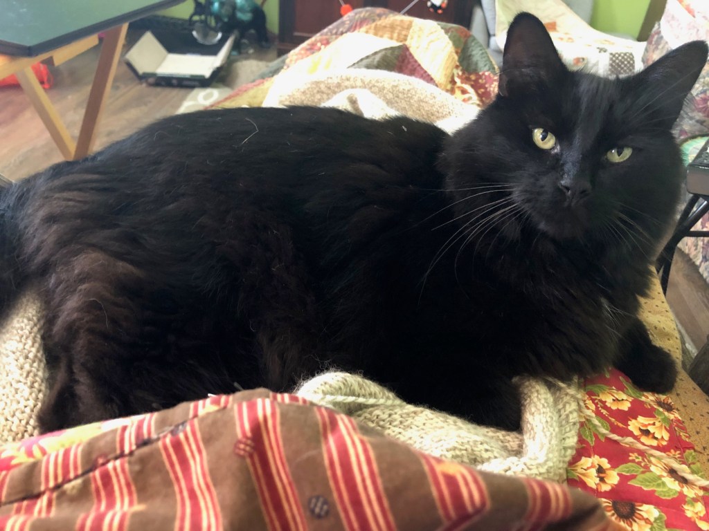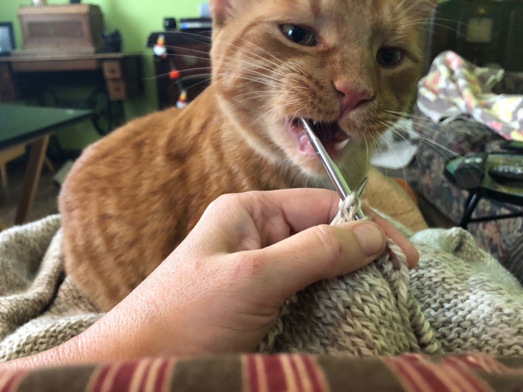 I only knit on mine when everyone is asleep for that very reason. The size of it makes it a target for critter butts. I had to rip out all the ribbing I had just finished. It was too floppy at the top. I had gone down too many sizes of needles too quickly and it was awful looking.