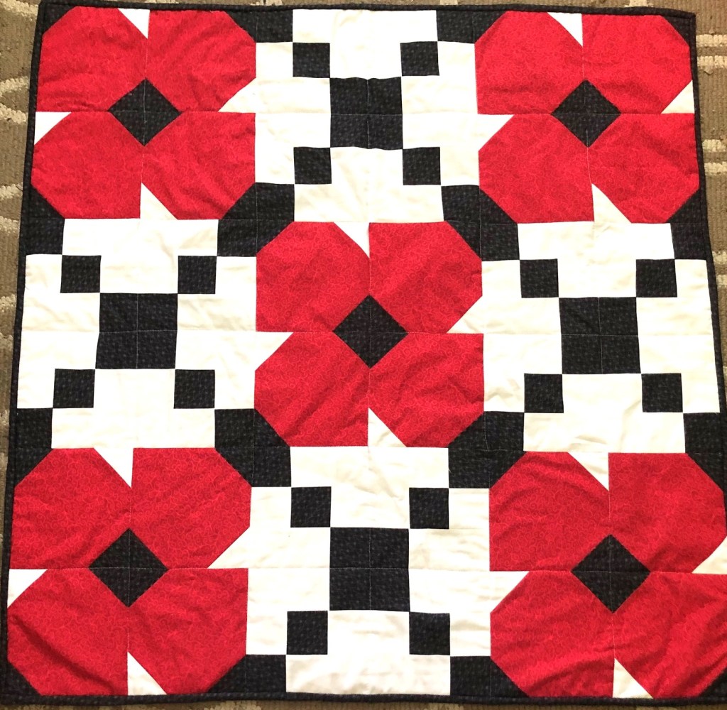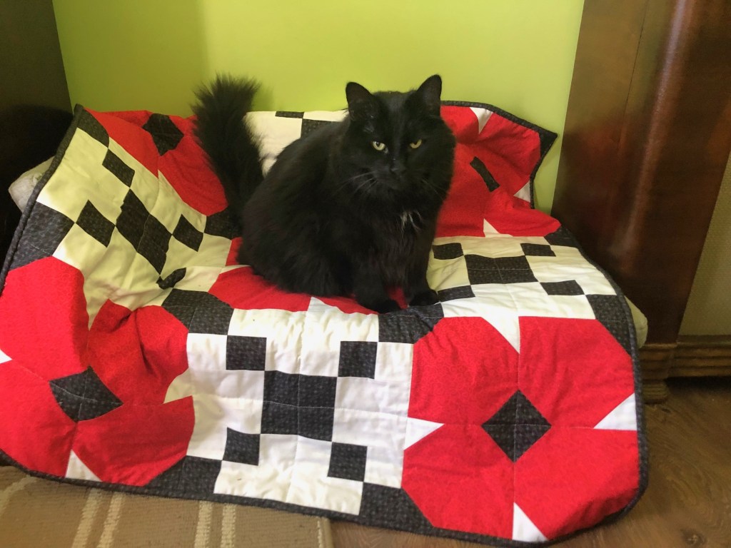 In addition to antiquing, knitting, and sewing Blockhead blocks, the weekend also saw me finish up Burton’s November quilt.
