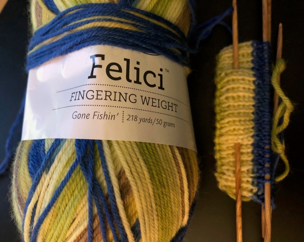 Last week, I had to take Dory in to get a stone chip in her windshield fixed. I knew from previous experience that it would take a little time. The GGS is much too big and bulky for waiting room knitting, so I grabbed some needles, and the second ball of Felici to get started on the second of my brother’s birthday socks.