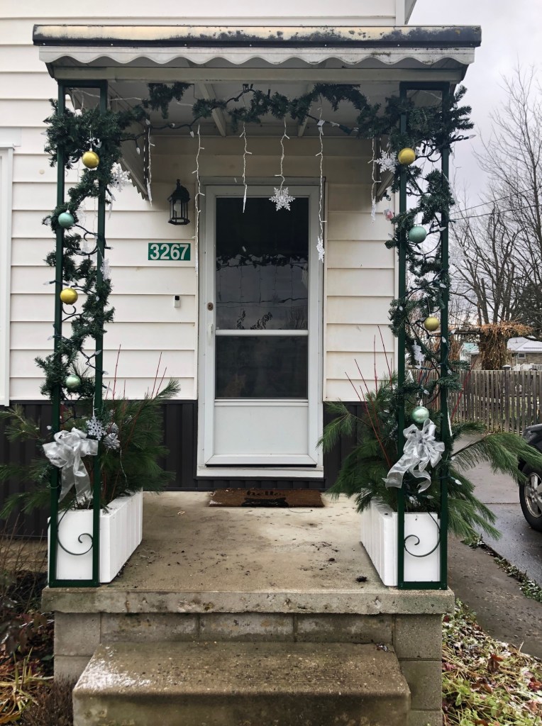 Pretty decorations and a welcoming entry. My decorations are pretty sparse: a small decorated tree, some framed Christmas cross-stitched pieces, and a fresh greenery wreath outside by the front door.