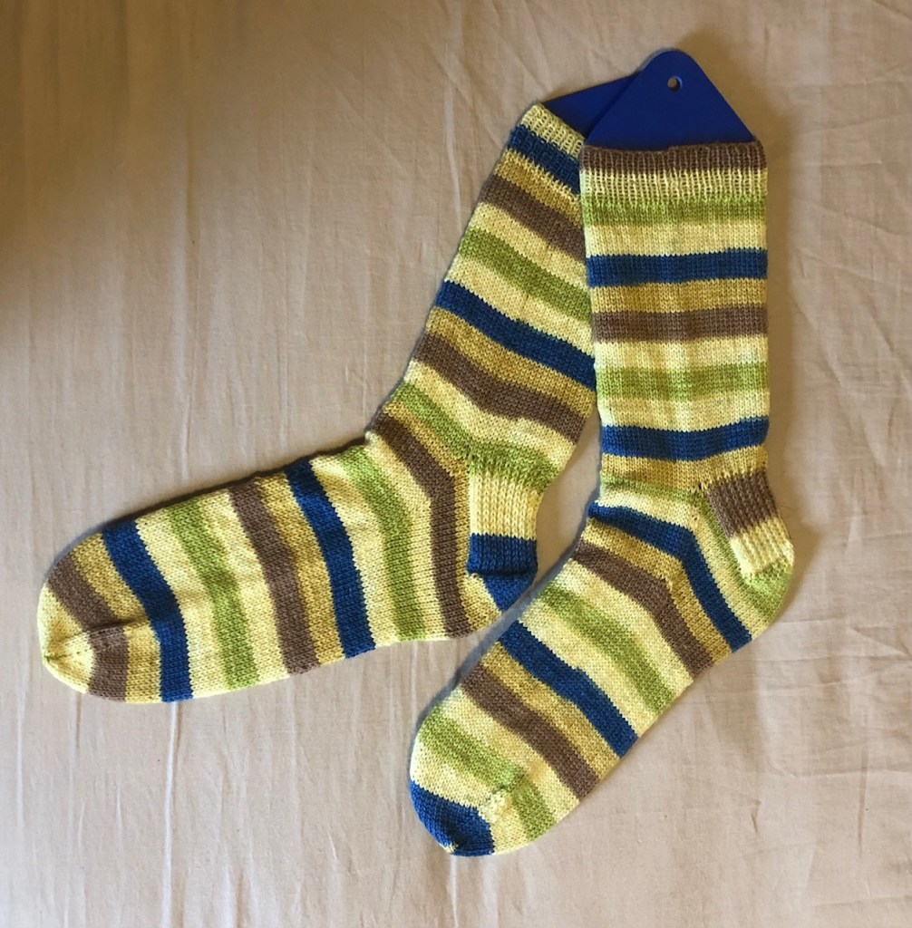 The yarn is Knit Picks Felici in “Gone Fishin”. Plain vanilla men’s socks using a cast on of 72 stitches and basic sock math. Nothing fancy, but it doesn’t need it because those fun stripes do all the work.