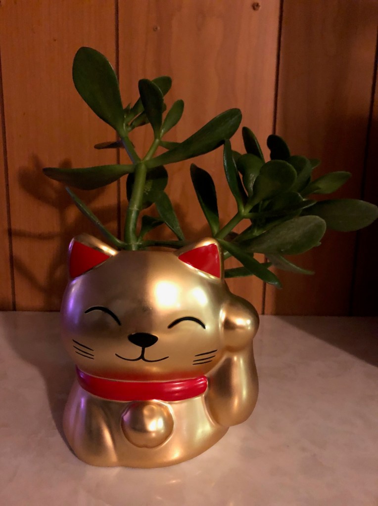 And I decided on a Lucky Jade for my Lucky Cat. I had a Jade before – Sam’s mom gave me a beautiful 60 year old Jade. Sadly, kitten Burton used the trunk as a scratching post and I didn’t notice until it was too late. I had some cuttings from it, but they died off last year, as I had them in a bad spot that didn’t get enough light.