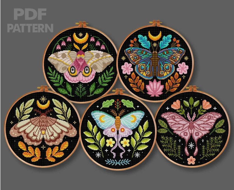 With my friend little bird cross stitch done and framed (she loved it), I needed to get something new in the hoop. For a while, I’ve been admiring a variety of patterns done on black aida. Eventually, I settled on a set of patterns from an Etsy seller.