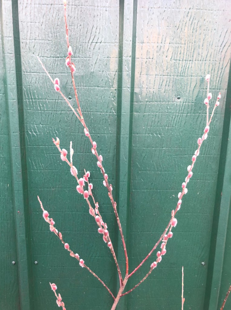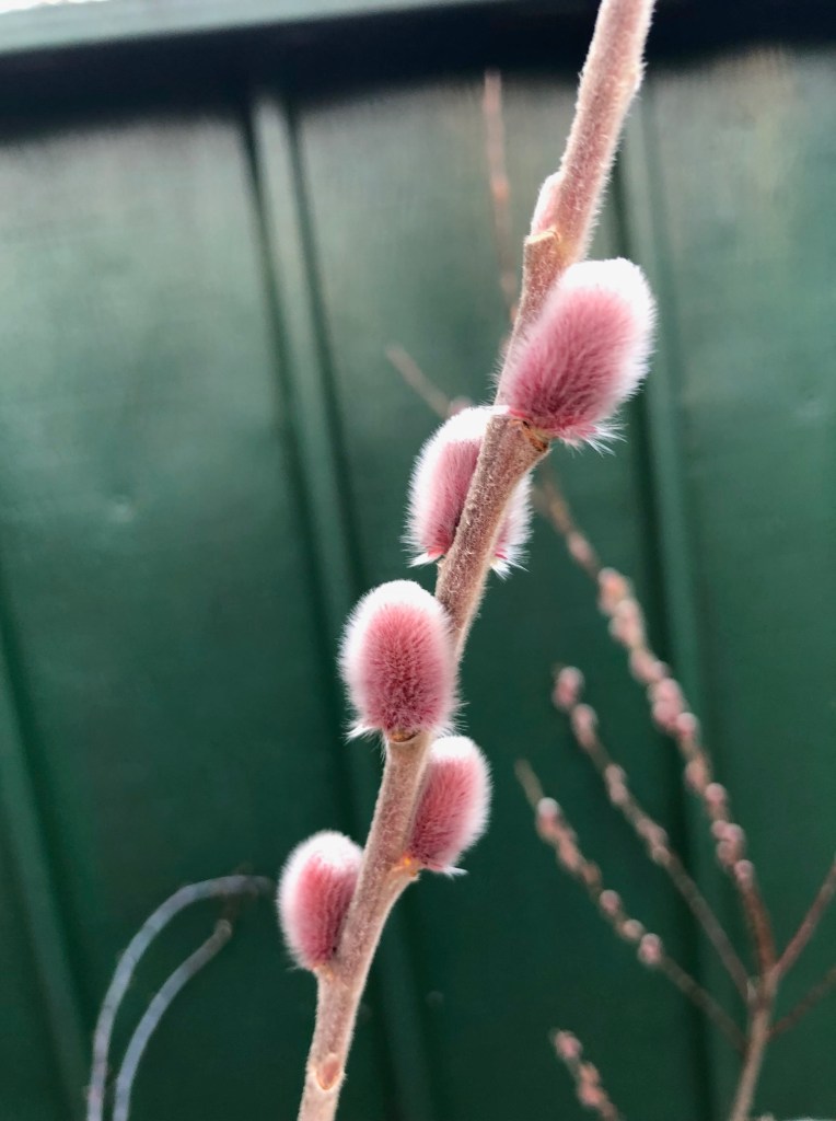 The pink pussywillow is in her full glory now. She’s always earlier than the others, and will eventually turn dark grey – but right now she’s just perfectly pink. I think I’m going to cut a few of these to put in my Blue Mountain Fish vase.