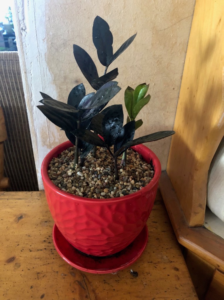 I do have a “regular” mid-green ZZ plant. But this one is a dark cultivar (there are several – this one is “Obscura” – but they all look more or less the same). The leaves are a deep dark green – almost black. If you like house plants, but have trouble keeping them alive – the ZZ is a great plant to try. They will take a lot of neglect, including low light.