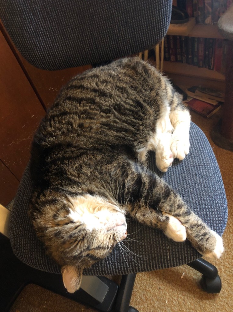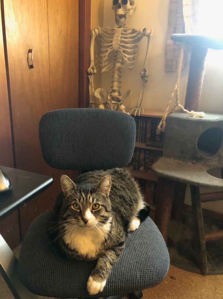 I have to keep a spare office chair beside my desk because Relic frequently shows up to work beside me.