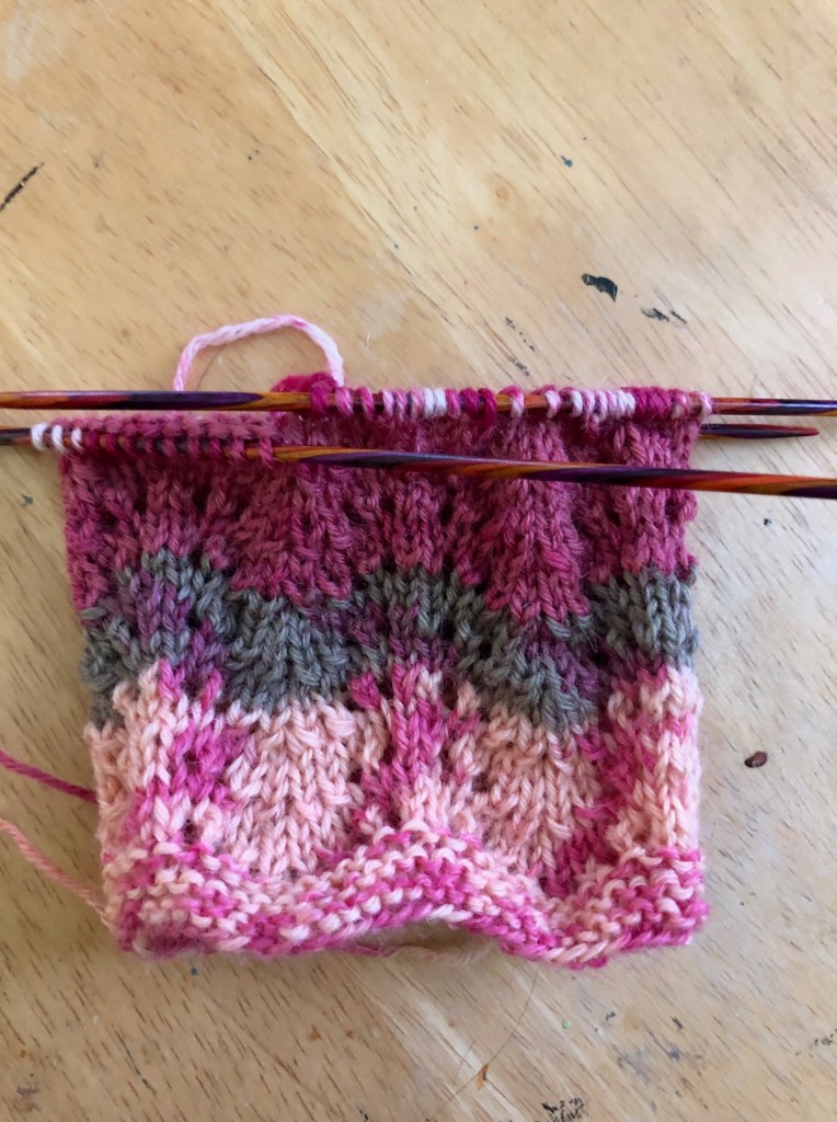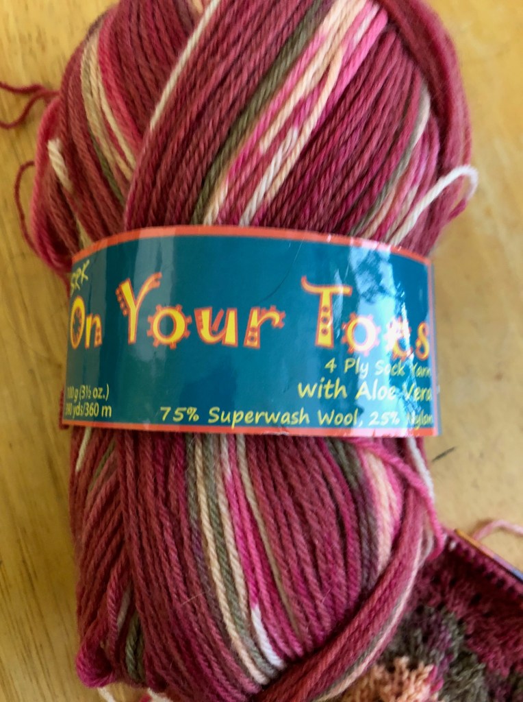 The yarn is On Your Toes (with Aloe Vera) in Rose Print. I’ve never knit with it before, but I picked this full ball up in a lot of yarn from a thrift store last year.