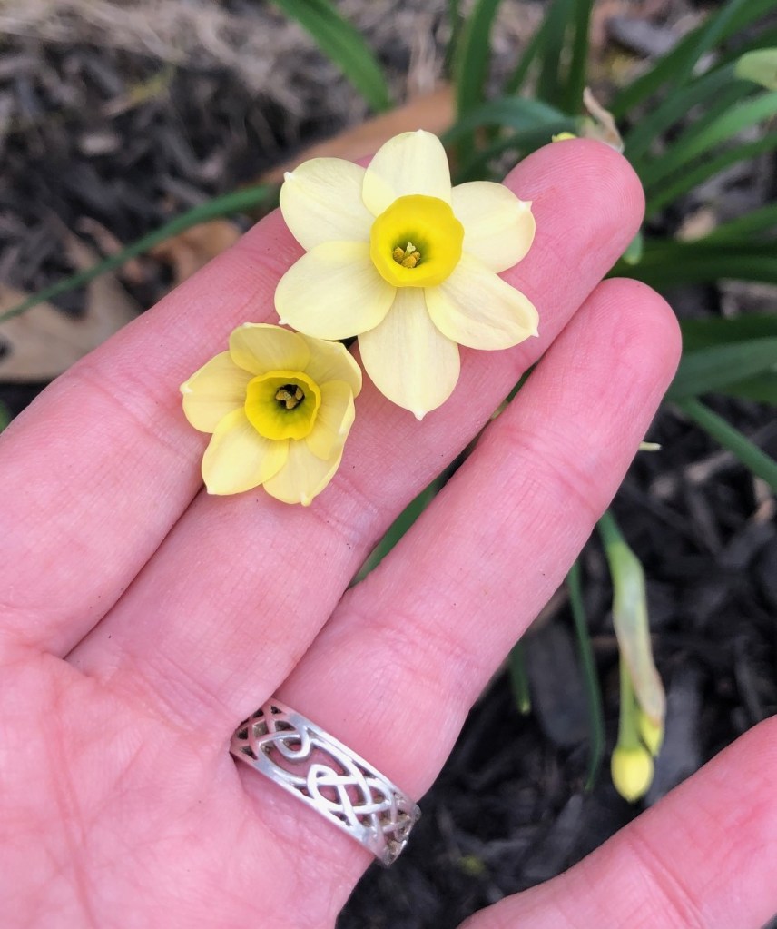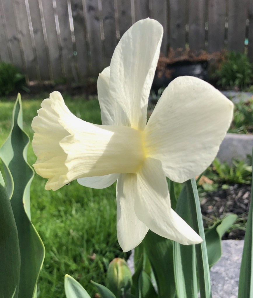 This one is called Mount Hood and it’s a new one I planted in the fall. It’s a big, solid white (though that trumpet is a little more yellow when it first opens). It’s not quite as big as the catalogue made it out to be, but as you can see by my hand there, it’s still a good-sized daffy.