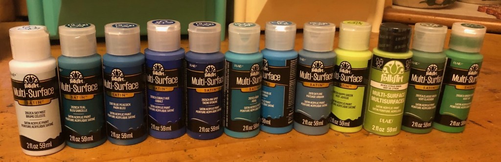 The older paints I kept are the few Martha Stewarts leftover, as well as some Folk Art Metallic which are at least 25 years old! And still paintable like they were the day they were bought. I really hope the new ones are just as good.