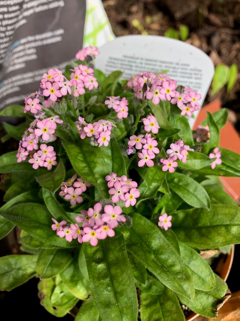 Pink Forget-Me-Nots! Did you know there was such a thing??? I did not! So you bet your bottom dollar I snapped that one up fast. Another blue one came along too. And since then I’ve found more growing among the daylilies in the fence garden. I have no idea where that one came from but it’s very welcome!