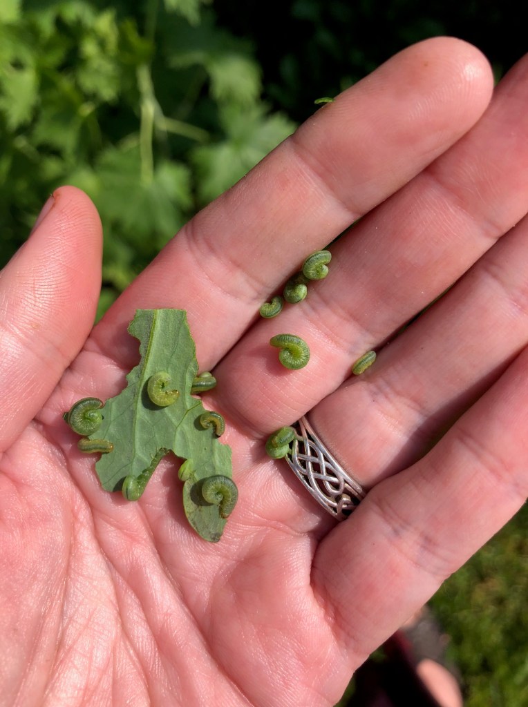 They are Columbine Sawfly (a cousin to the ones I get on my roses), and they completely defoliate the plants (though they leave the flowers.) It usually doesn’t kill the plant, but it does make it look rather sad. Happily the leaves will grow back, and we may even get more flowers later in the season. But I will be on the watch for these guys next year.