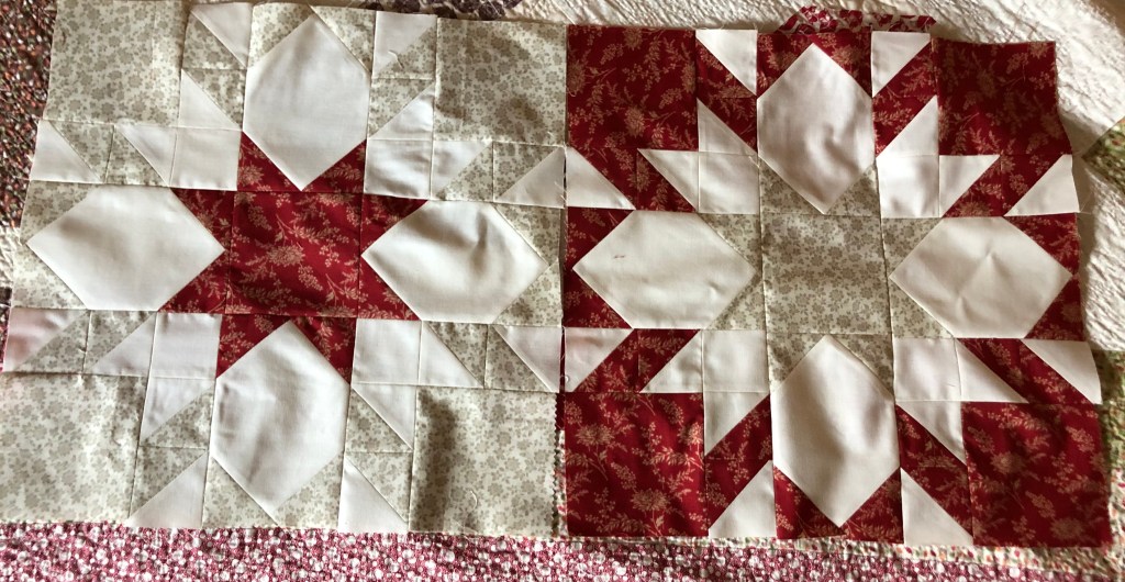 When Mom came, she stayed for a couple of days. I rearranged my studio a little, as she had brought one of her Featherweight machines – and we had a little sewing day. While she worked on some bowtie blocks, I finished the last two blocks needed for my Jubilee quilt