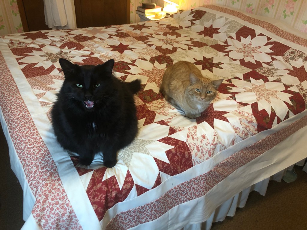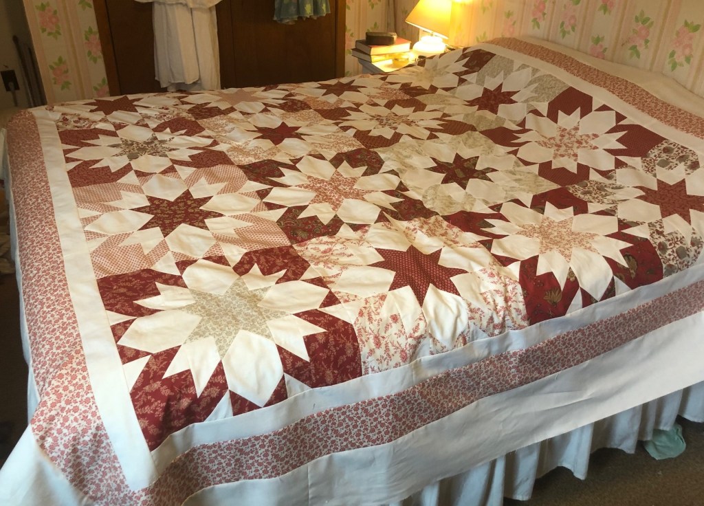 Naturally, Burton had to be right in the middle of things. The blocks went together pretty quickly. They are big (16″) and are only 16 of them. Once they were together, it was just a matter of adding some borders. I wanted it big enough to cover the bed, and drop down the sides to past the top of the dust ruffle.