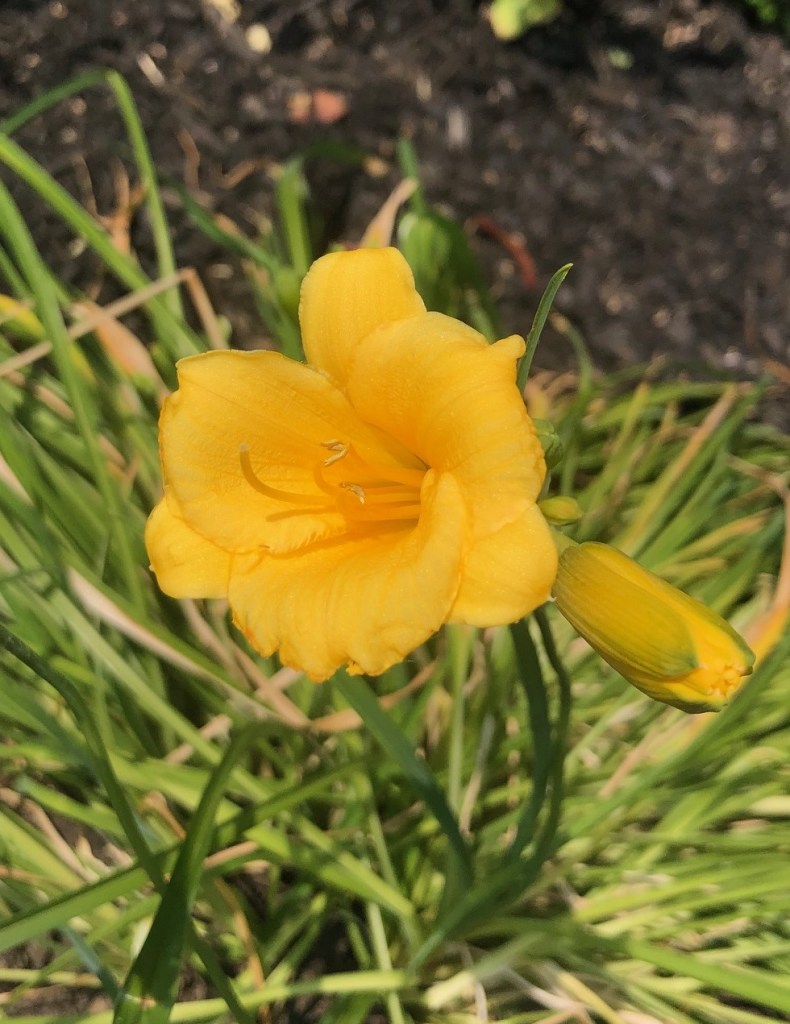 Stella D’Oro has the honour of being the first day lily to bloom. Stella D’Oro is one of the most common Daylilies next to our wild orange “ditch” lily. It’s a smaller Daylily, and it will bloom all summer long. It also needs next to no maintenance, making it a popular choice for commercial and office property gardens, which is where you see it most often around here.