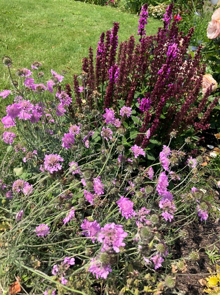 I love the combination of the pink Pincushion Plant, and Pink sage at the foot of the walkway garden.