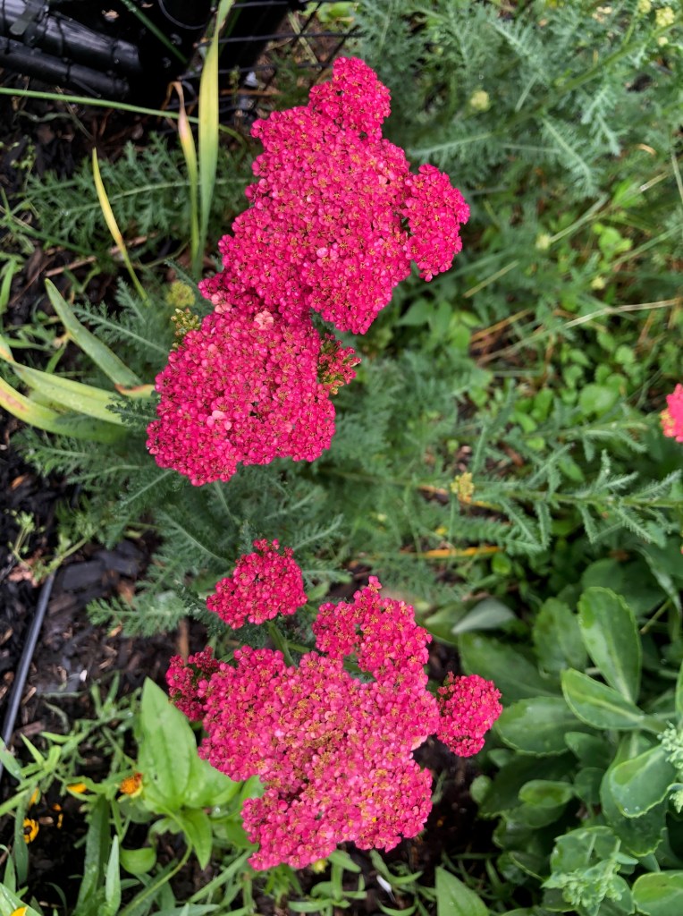 Yarrow has so much going for it. It’s a native plant (though these above are all cultivars). The polliinators LOVE it. It bloom allllll summer It has a very pretty, feather, fern like foliage. It reseeds, and competes well with weeds, as it’s a wildflower that grows in grasslands.