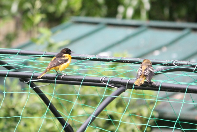 And do you see that orange streak behind her????? I didn’t notice THAT until I downloaded the pics. I’ve been seeing orioles quite a bit this year – but always in flight. So I was delighted when this one stopped for a wee second on top of the squash tunnel.