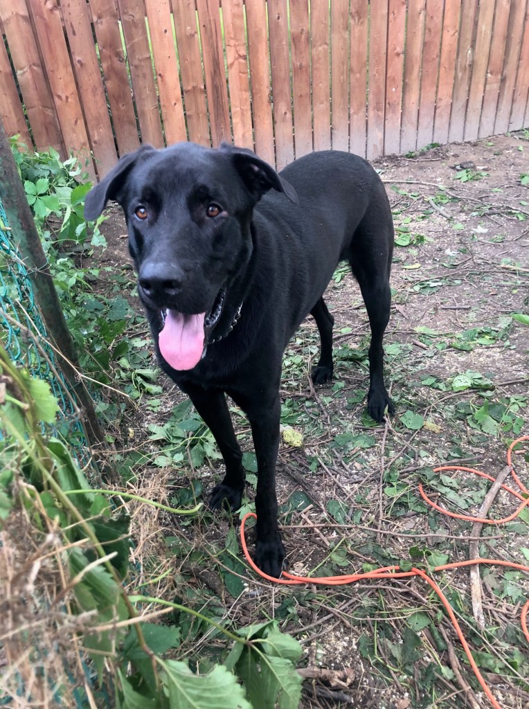 He’s a VERY big boy – a shepherd/lab cross, with I suspect a little Great Dane mixed in. Eventually, there will be a taller fence between our yards – the current one he could clear with a simple leap. But for now I’m making sure I have Milk Bones in my pockets whenever I head out to the back yard.