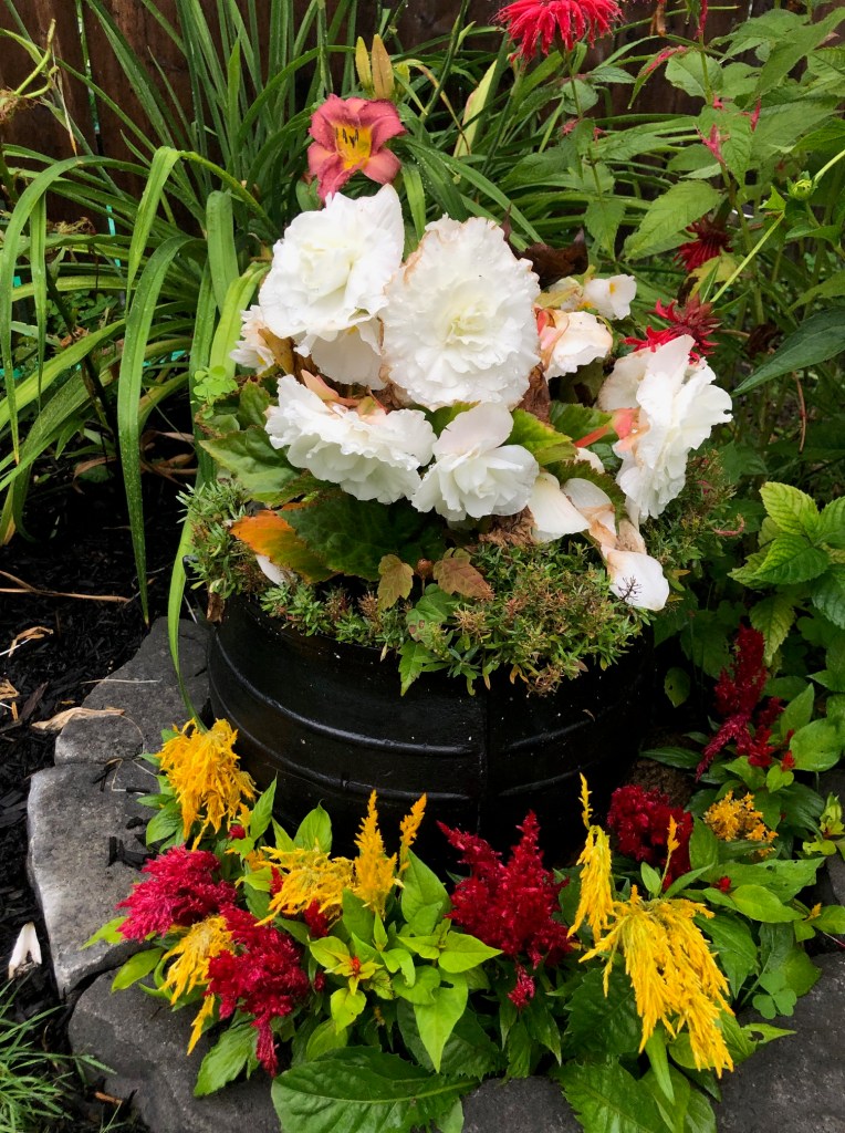 I can’t remember if I showed my cauldron or not this year… the celosia “fire” is burning brightly, and while the frothy bubbles of alyssum have died off, the white begonia is absolutely overflowing!