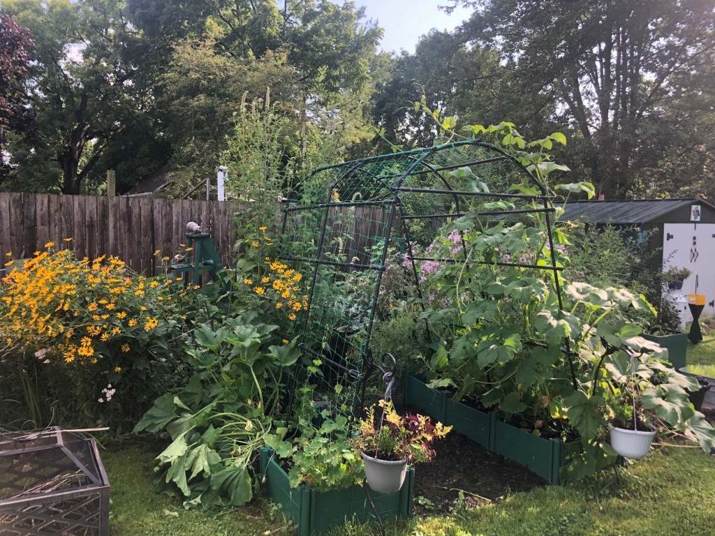 The gardens are overgrown and absolutely exploding. The squash tunnel stands about seven feet high, and you can see the Hyssop (a native plant) behind it growing at least a foot taller.