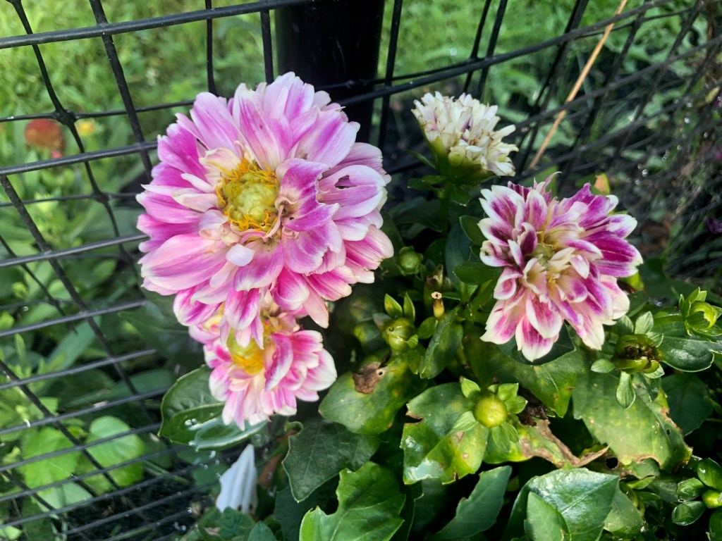 The rain has even helped a few of my dahlias. These ones are in a pot inside the catio, along with some white pansies. I was quite surprised to see them blooming so well.