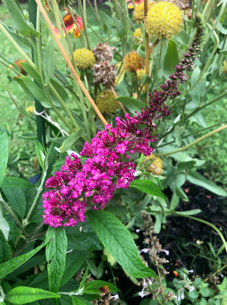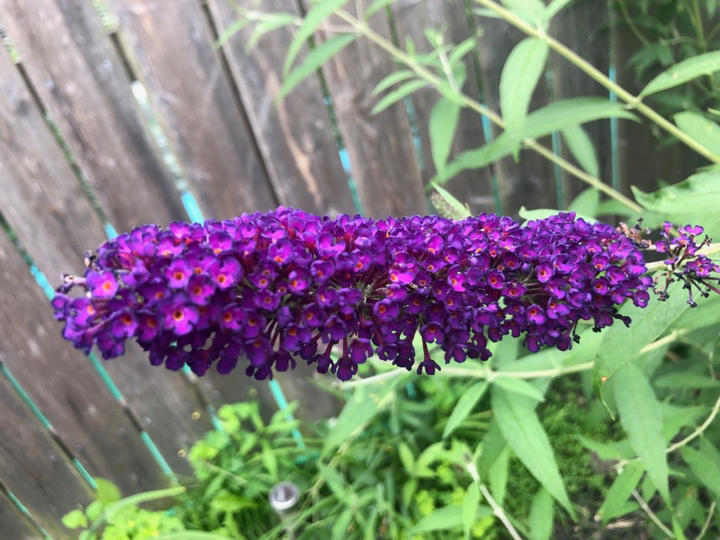 This sign isn’t quite new – I bought it – I think – in the winter. It was on clearance. But I finally decided on the perfect spot for it – on the catio fence in the butterfly bush. That’s the big white one (White Profusion). It’s the biggest, but it’s almost always the last to start blooming. You can just see a few bloom spikes starting.