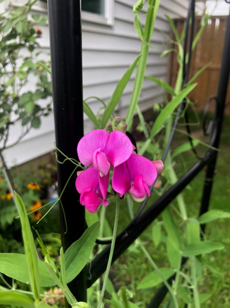 And this is super exciting! Back in may, I planted some annual sweet pea seeds at the base of the new arbour. But they didn’t take (I’ve always had issues with sweet peas). But… a few weeks later, I found a couple perennial sweet pea plants at a garden centre. They’ve been growing well, but I was starting to think they would never bloom. But I went out there the other day – and there were these bright pink flowers staring back it me! The only down side is the perennial ones don’t have the lovely scent like the annuals do. But…. at least these one are growing.