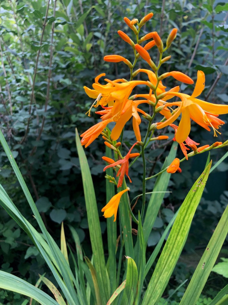 The Crocosmia are blooming. I have this one – called Sunglow. And a pretty red-orange called Montbretia. They have such a beautiful tropical look. They are native to East and South Africa, and it amazes me that they can grow here.