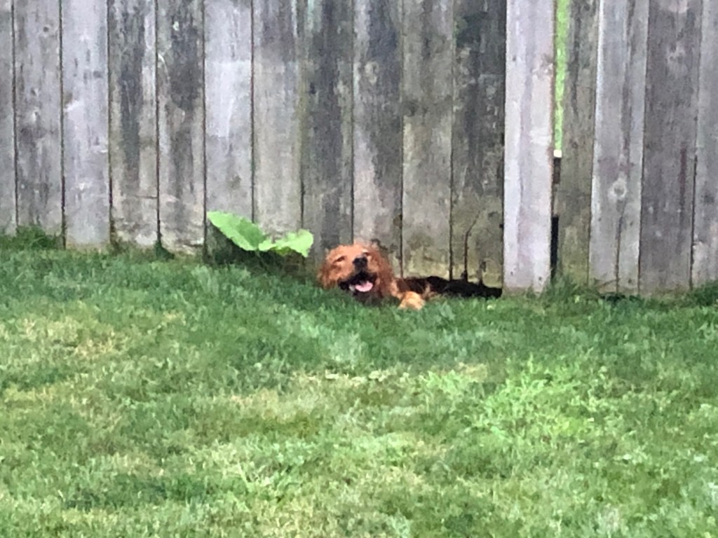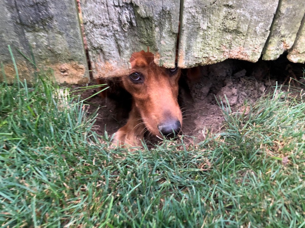Her name is Ruby. Ruby would love to come over every day and play with Chevy and Jem. So Ruby tries. She likes to dig holes big enough to get her head under the fence.