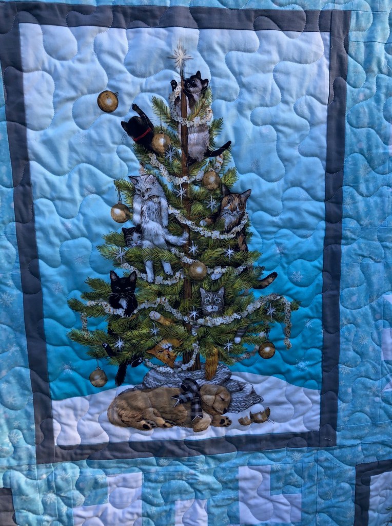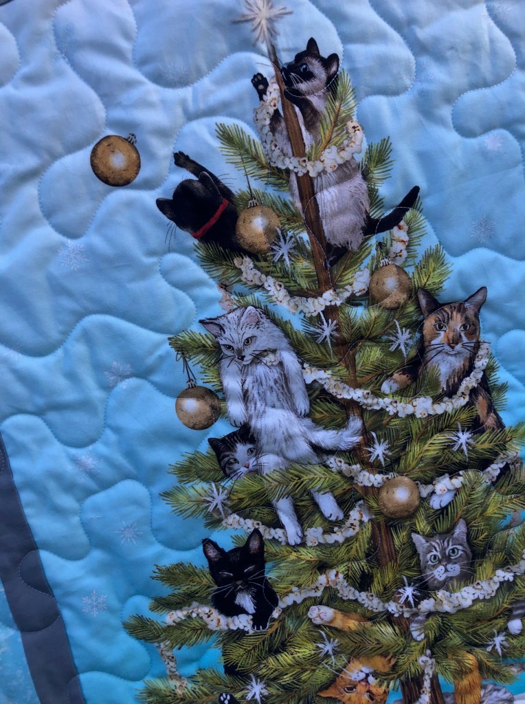 It’s called Fireside. It’s a fluffy polyester – somewhat similar to Minky, but it’s not as slippery. It is sooo warm and snuggly though – just the perfect thing to put on the back of a kitty Christmas quilt!