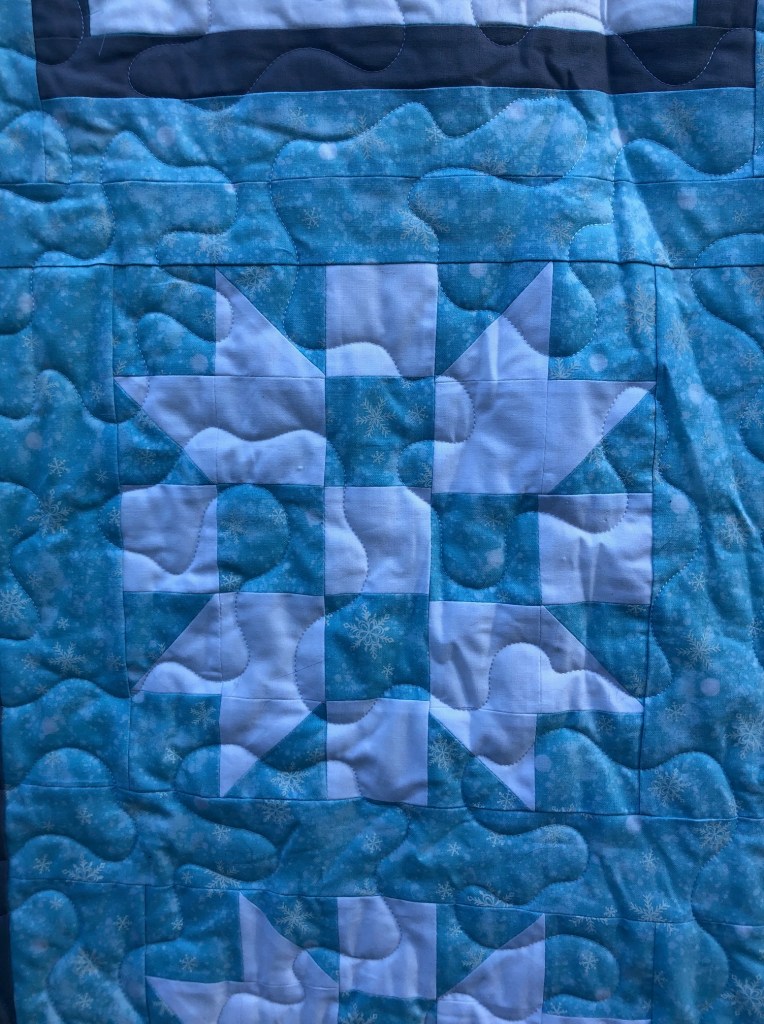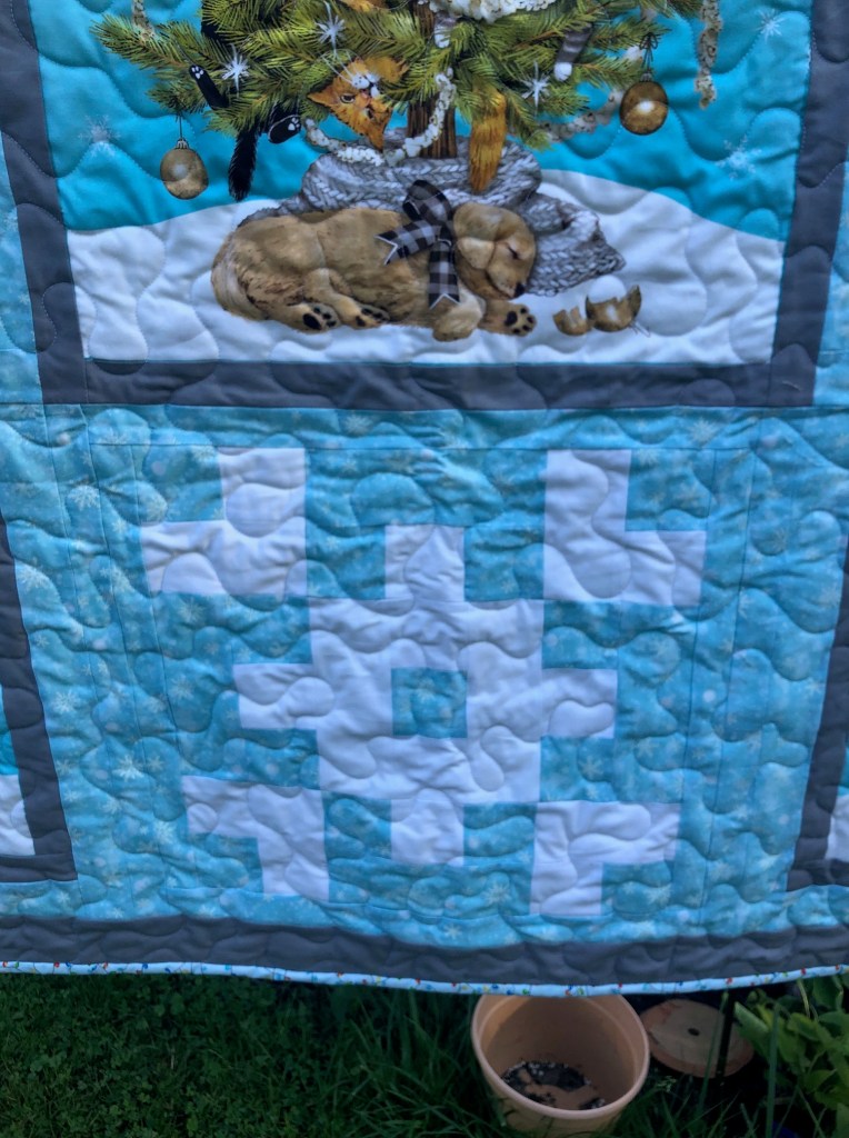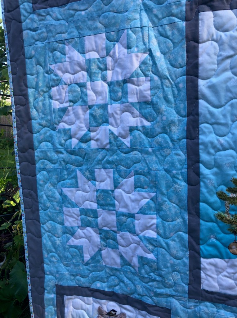 In addition to quilting my red quilt, I also took the three Christmas quilt tops I completed last month. First finished was the one made from the panels.