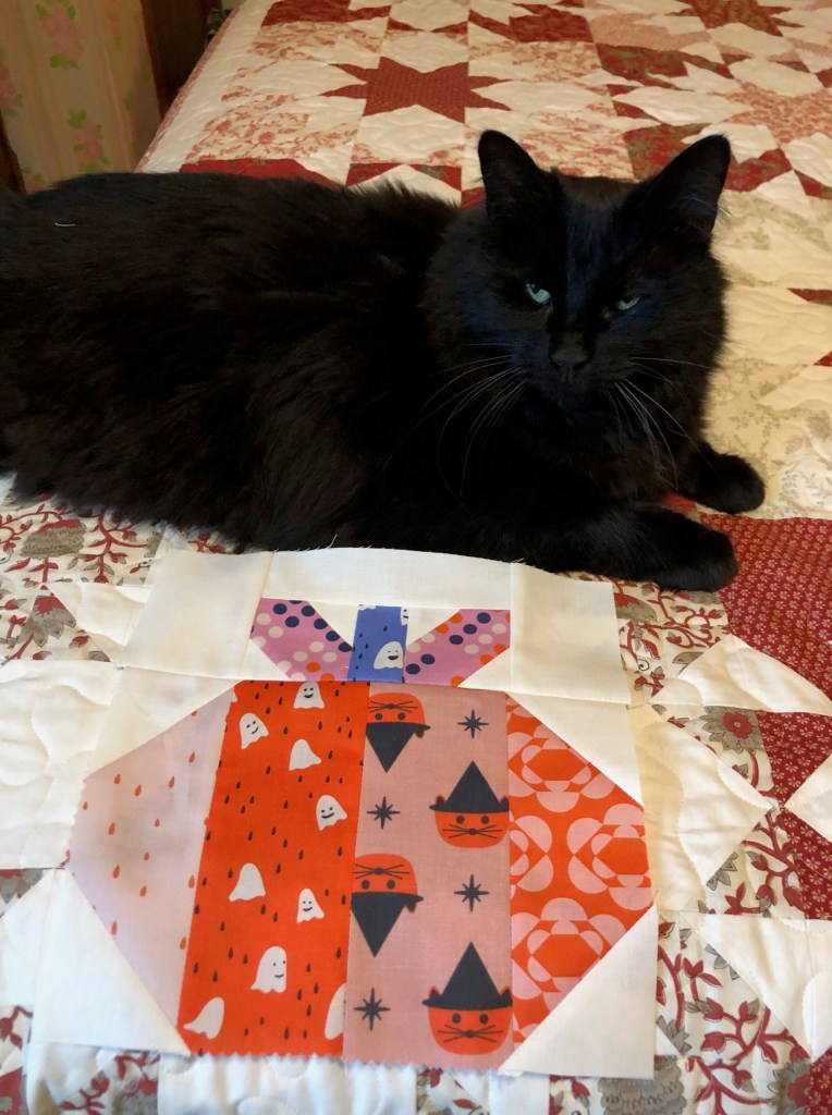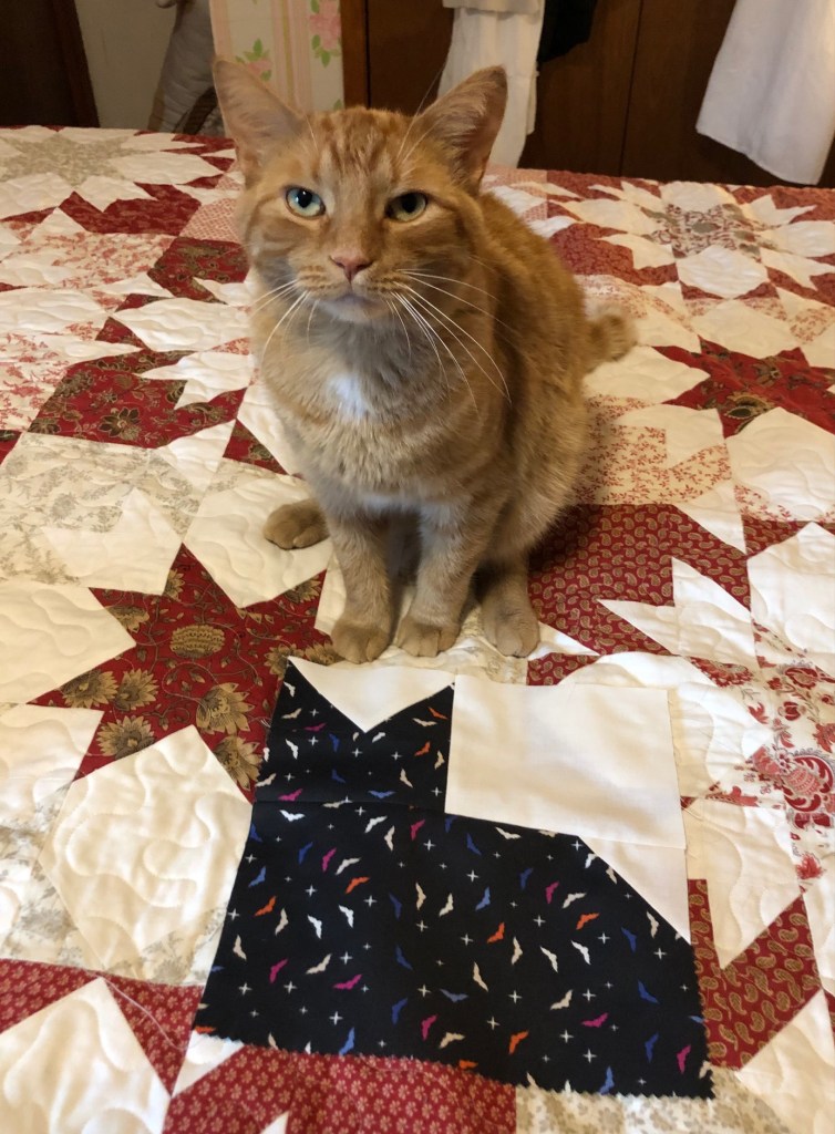 I made five of these super simple cat blocks. If they look familiar, they care the cats from Pins and Paws, of which I’ve made a couple of quilts.