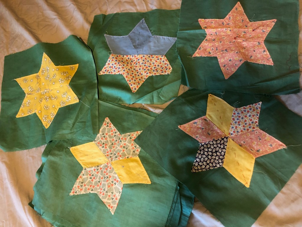 I have no way of knowing how old they are, but my guess is somewhere between 40s and 60s judging by the fabric. It looks like the stars were hand-pieced, then hand basted on the green fabric (the basting stitches are still there). But the stars were then sewing down with a machine.
