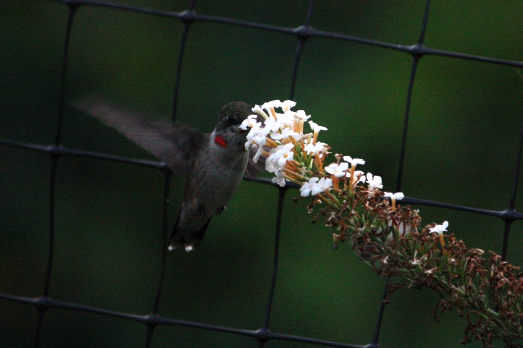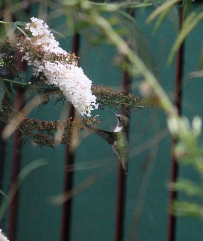It didn’t take long for them to appear, and there were at least three of them fighting for airspace around the catio. Like the first, day, they did not seem to appreciate my presence near the honeysuckle. This time they opted for the white Butterfly bush.
