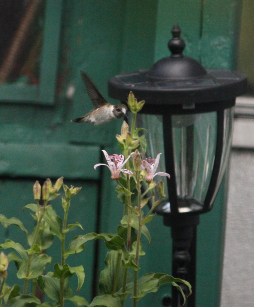 So far, the little hummers have been faster… but one day one might not be. So the toad lilies will be getting a new home soon.