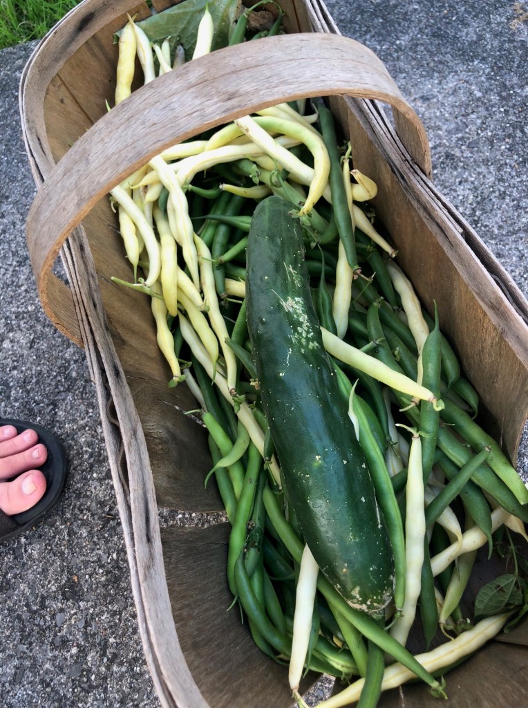 The beans are still going crazy – and I’m giving them away whenever I can. And you can see, there’s another big cucumber on top. I thought the cucumbers were done for the year, but it seems they’ve gotten a second wind.