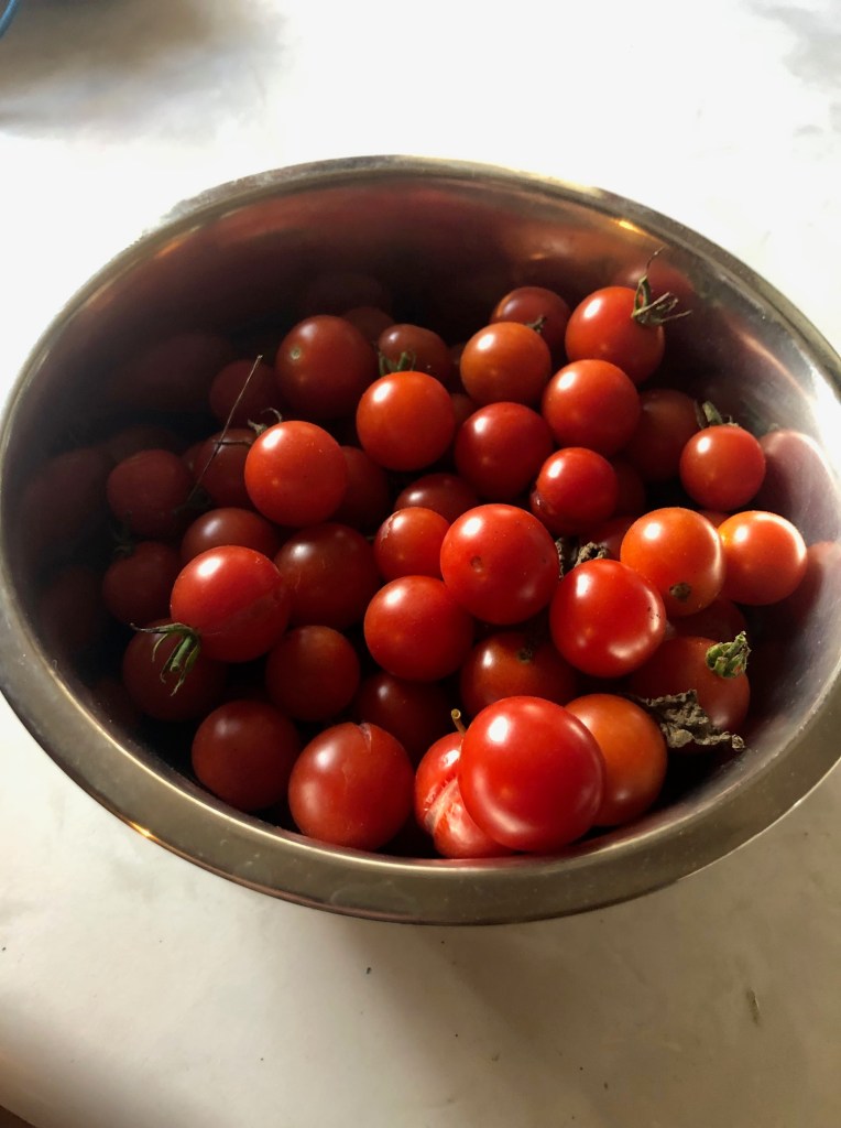 They are just cherry tomatoes but they would take over the house if I didn’t have people to give them to! Like most of what I grow, I don’t eat tomatoes, so it’s up to poor Dave to try to put it all away. But it’s been just impossible for the poor guy. I came down the other morning and he was slicing some up to put on a BLT for breakfast.