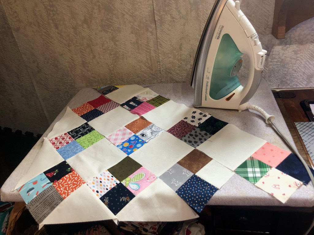 So after at little thinking, I devised a way to do it in steps. I’m putting the four-patches on point, with a plain off-white square in between each, so I laid the first few rows of the first corner out on my machine-side pressing station.