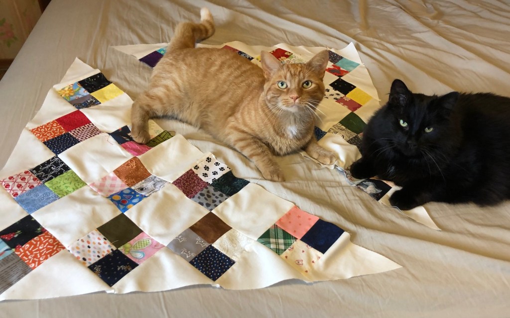 So pretty – the corners and the cats!!! I think that is a great way to approach the assembly. I am going to try it the next time I have an on point top. I don’t have space to lay out an entire top except in the floor which gets tossed if I turn my back.