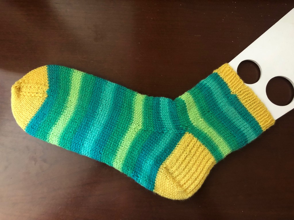 I’ve got the first sock of a another pair for me off the needles. The yarn is Felici – colour is Aquarium – with some yellow Stroll for ribbing, heel and toe. I’m hoping to get the whole pair off the needles by the end of the month… Just nine days. I think I can, I think I can!