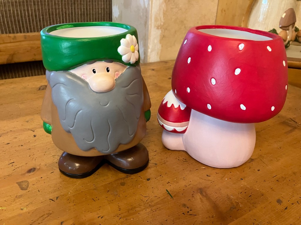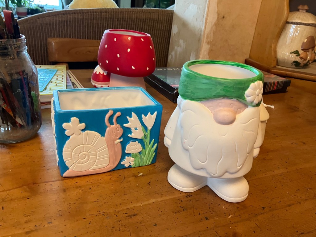 But now they are finally done (The higher-quality paints made all the difference!) And if you’re wondering what happened to that snail planter… he’s in a time out. Even the better paints couldn’t make painting all his little details fun. Part of it is my hands aren’t as steady as they used to be, and my eye sight definitely isn’t as sharp. I gave up. Dave said he’d take a stab at it (he paints model ships regularly) but we’ll see if he actually does.