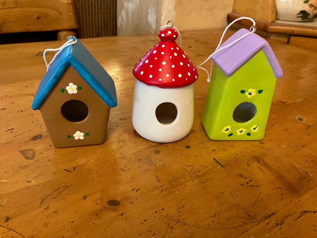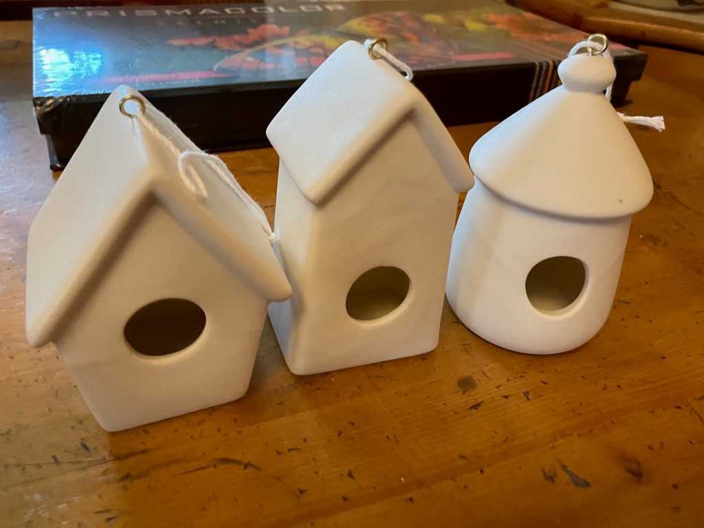 And while I was waiting for coats to dry on those, I painted up these three little birdhouses we got for sale at Michaels several weeks back.