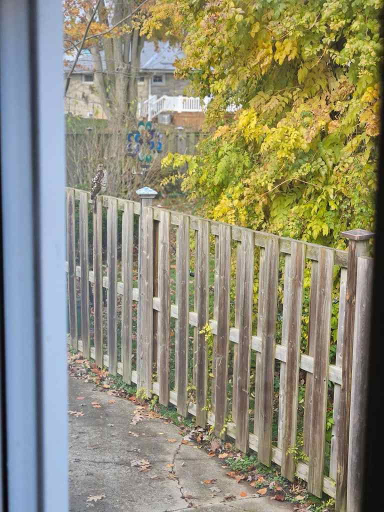 A few weeks ago, I was upstairs, and Dave yelled up to me to get my camera. There was a hawk in the fence.